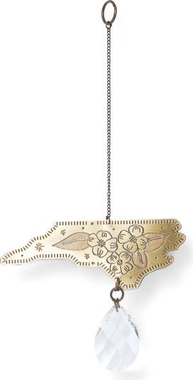 North Carolina States beloved state flower, the Dogwood, is featured on this hand-engraved brass state-shaped suncatcher. The design captures the soft, four-petaled blooms with fine detail, paired with a faceted crystal that scatters light into your home. Its a warm reminder of the states landscapes and southern charm. It is a beautiful gift for North Carolina State natives or anyone who treasures spring blooms.