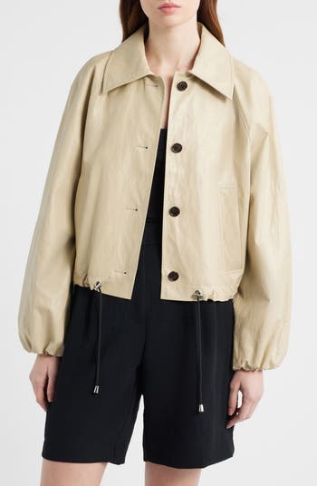A trench-coat aesthetic defines a glossy faux leather option set with billowed sleeves and cinched with a drawstring hem.