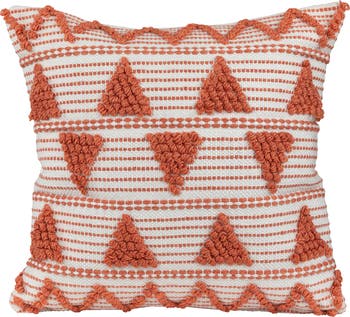 Bring a touch of rustic charm to your outdoor space with our orange and cream outdoor pillow. Expertly crafted using traditional handloom techniques, this cushion features a unique triangular and striped, textured design that adds a pop of color and texture to your outdoor seating area. The durable material ensures that this cushion will stand up to the elements and provide comfort for many outdoor gatherings to come. Whether you're lounging by the pool or hosting a backyard barbecue, this cushion is the perfect accessory to elevate your outdoor decor. Product Features: Outdoor square textured pillow Designed with handloom woven polyester yard Orange and cream triangular and striped design Adds comfort to patio chairs and sofas Suitable for indoor and outdoor use Care instructions: use soap or detergent, rinse with clean water and allow to air dry Dimensions: 20" high x 20" wide Material(s): polyester