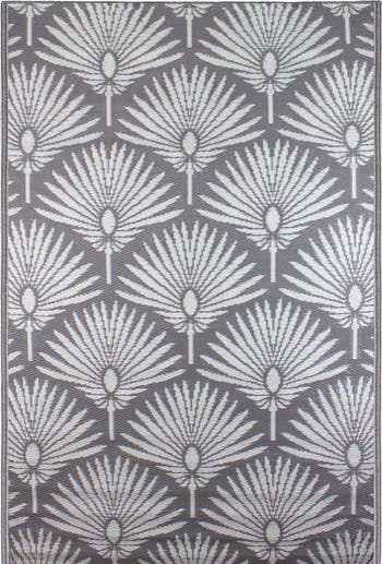 Our gray and white tropical fan leaf palm rug features a textured weave that's super comfortable underfoot. It is mold and mildew-resistant and built to withstand color fading from the sun. It has been designed to hold up exceptionally well in high-traffic areas, whether it is used indoor or outdoor. The flat weave design of this rug melds style with durability, making it the perfect accessory piece to any porch, poolside deck, backyard patio, or indoor space that needs an easy-to-care-for rug. Product features: Color(s): gray and white Shape: rectangular Machine made Outdoor safe Easy care Pile height: flat Backing: no Easy-to-clean, stain resistant, and does not shed May be used with a rug pad for extra comfort, protection, longevity and safety (not included) Dimensions: 4' wide x 6' long Material(s): polypropylene