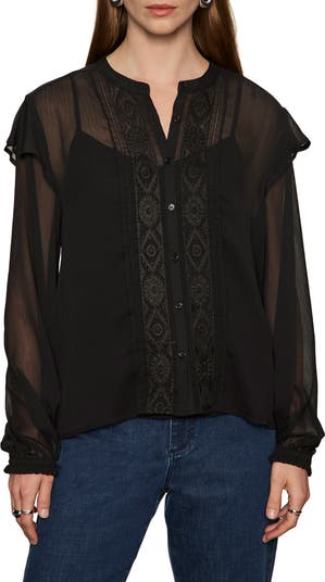 Enchanting embroidery and soft frills romance this blousy top cut from sheer georgette fabric.