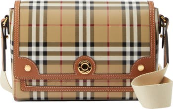 An archive-inspired crossbody bag made in Italy from a coated cotton blend printed with the Burberry Check and lined in cotton. The design is trimmed with smooth calf leather and has a logo-engraved closure. Carry across the body or wear on the shoulder using the detachable strap.||Detachable, adjustable webbing strap |Foldover flap with magnetic closure |Exterior slip pocket, interior slip pocket |Hand-painted edges |Polished metal hardware |Cotton lining|Comes with a dust bag
