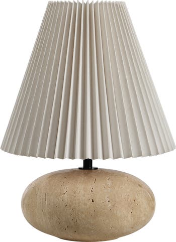 With a travertine base and a pleated drum shade, this compact table lamp adds ambient light and neutral color to small spaces.