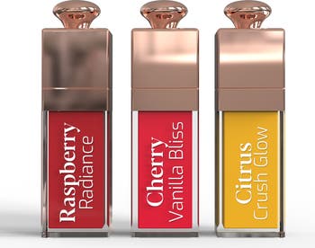 - Perfect for Everyday Use: Enjoy a light, glossy feel that’s never sticky—ideal for work, weekends, or a night out. Moisturizing Formula: Professional-grade hydration that helps soothe and repair dry, chapped lips. Subtle Tint & Shine: Adds a natural rosy hue that enhances your lips’ appearance while keeping them soft and smooth. Delectable Scents: Each oil is infused with a unique, feel-good fragrance that delights your senses. Included Flavors: Cherry Vanilla Bliss: Sweet, comforting, and warm—perfect for a cozy day or evening elegance. Citrus Crush Glow: A refreshing burst of revitalizing nourishment with a bright, uplifting scent. Raspberry Radiance: Juicy and berry-infused, this formula adds moisture with a fun, fruity finish.