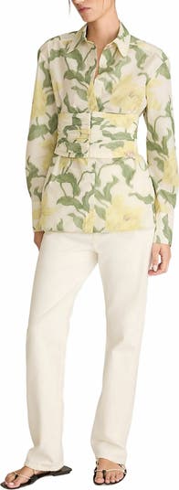 This cotton blend taffeta top has a corseted cummerbund detail at the waist with hook-and-eye closures. It has a center front placket, shirt collar and cuffs, and a shirttail hem in a warp print of art deco-inspired lilies. This piece is fitted at the waist. If you are between sizes we recommend sizing up.