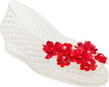 Your favorite '90s-nostalgia footwear is back—and more comfortable than ever—in this jelly ballet flat made using the South Korean label's signature square-perforation weave in flexible PVC. Wonderfully weird and certainly playful in its aesthetic, the toe is embellished with cluster-bead flowers for a playful mix of polish and whimsy.