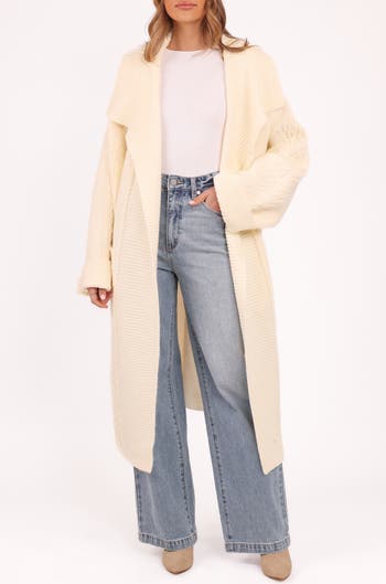 Dimensional cable knitting elevates the longline profile of this statement cardigan designed to anchor cool-weather looks.