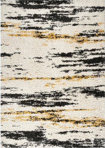With abstract stripes creating a strie' effect, this modern rug is the perfect anchor for a contemporary or minimalist space. The overall pattern is a family-friendly solution for a living room, bedroom, hallway or entry. Soft and fluffy shag yarns make it easy to go barefoot.