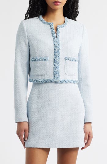Textured trim creates two-tone dimension on this tweed dress updated in a leggy length and suspended by slinky straps.