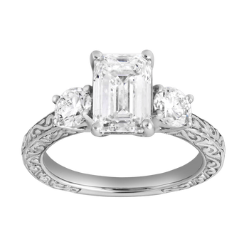 Elegant and distinctive the Novelle engagement ring features a dazzling emerald cut lab grown diamond set in polished 14K gold. The elongated step cut facets of the emerald shape create a sophisticated hall of mirrors effect offering refined brilliance and a timeless graceful presence on the finger. The center diamond is beautifully accented by two round side diamonds that add balance and extra radiance to the design. This classic three stone arrangement enhances the brilliance of the ring while symbolizing the past present and future of your love. The band showcases delicate vintage inspired engraving along the shank adding intricate texture and antique charm to the design. The combination of the engraved band and luminous diamonds creates a romantic ring with both vintage character and modern refinement. Refined and meaningful the Novelle ring is a beautiful symbol of love and commitment making it an ideal choice for proposals anniversaries and life's most cherished celebrations. Diamond carat weight may vary up to 2.65 carats from the stated weight. Made in U.S.A. The ring is accompanied with an IGI certificate guaranteeing authenticity and with the certificate number inscribed within the band.