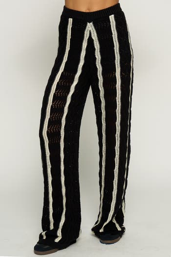 Bold yet breathable – These black crochet-knit pants feature openwork detailing for a stylish, airy feel. Flattering vertical stripes – Off-white contrast stripes elongate the legs and add a striking touch. Soft & flexible fabric – Blends comfort with just the right amount of structure. Easygoing yet elevated – Dress them up with heels or keep it casual with sneakers for a versatile, head-turning look.