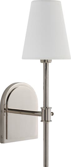 Lend a little warm light to any space with this timeless wall sconce crafted with a nickel-plated finish and a white linen shade.