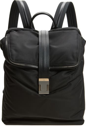 This nylon backpack keeps items secure with both a top zip closure and a fold-down top secured with a leather buckle strap. Crafted in Italy for lasting durability, it features an interior pocket and the brand's signature red lining