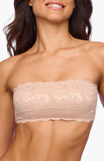 • Wireless bandeau bra construct with soft, stretch scalloped lace that lays flat.