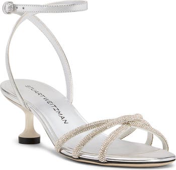 A pedestal heel elevates this strappy sandal that kicks up light with crystals and a high-shine metallic upper.