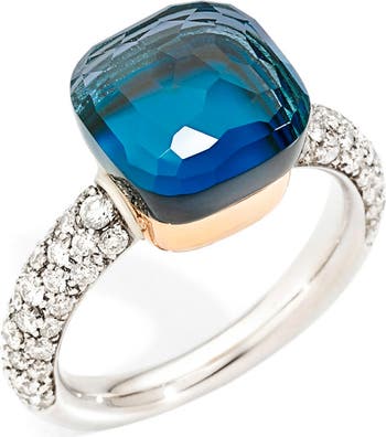 A grand total of 58 brilliant pavé diamonds flanks the sides of this opulent, Italian-crafted ring centered with a faceted London blue topaz in the label's iconic 'nude' setting.