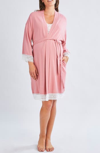 Stay comfy and cozy after baby arrives in a lightweight nursing dress paired with a soft, crochet-trimmed robe and a matching blanket that you can wrap baby in.