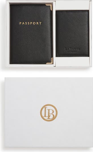 A sophisticated pairing of travel and everyday essentials, this gift set includes the Nutcombe Passport Holder and matching bifold card holder, both crafted from 100% plant-based leather. Designed with clean lines and refined detailing, the set offers a polished solution for keeping important items organized at home and abroad. The passport holder features protective gold-tone corner hardware that helps safeguard travel documents while adding an elegant finish. The compact bifold card holder includes six card slots, providing convenient storage without bulk. Together, they create a coordinated set that balances practicality with understated luxury. Presented in a white linen gift box with a gold logo, this set arrives ready for gifting.