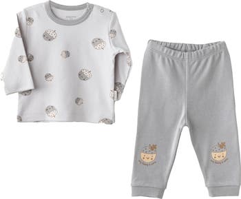 A soft and playful duo featuring cheerful nut characters and cozy gray tones—perfect for everyday comfort and smiles. Long-sleeve top with allover nut character print and shoulder snap for easy dressing. Coordinating pants with footed design.