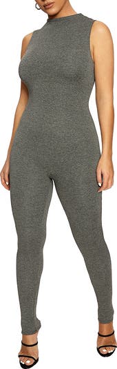 Sleek, modern lines and a second-skin fit define a sleeveless jumpsuit that delivers eye-catching all-in-one style.