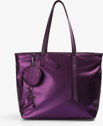 Metallic tote bag made of nylon fabric. Double straps and zip fastening. Purse detail.