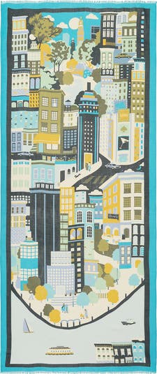 Illustrated buildings and winding streets bring a lively, city-inspired feel to this oblong scarf framed by a bold border.