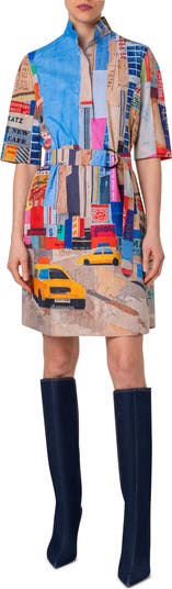 A collage of NYC signs seen from subways to streetlamps colorfully patterns this shirtdress featuring a double-D-ring belt and cut from crisp cotton poplin.