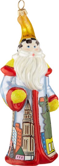 Made from fine blown glass and dusted with sparkly glitter, this handmade Santa ornament celebrates the season along with New York's icons in pop-art detail.