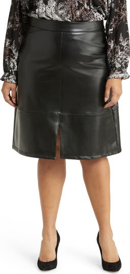 Sleek faux leather sculpts your figure in a flattering A-line skirt with a center slit at the front for ease of movement.