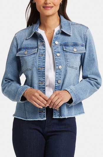 A fresh take on the classic denim jacket, this fitted version features a frayed, slightly cropped hem and slanted front seams for a tailored finish.
