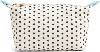 Gleaming logo hardware and contrasting, heart-shaped tabs highlight the charming dot pattern and durable nylon exterior of a voluminous pouch perfect for storing small toiletries or travel essentials while on the go.