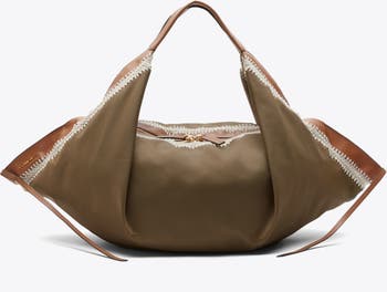 - 90% Nylon, 10% Leather Cow Trim, Lining: 100% Polyester
