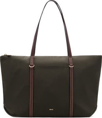 Signature logo hardware and contrasting faux-leather trims highlight the durable nylon exterior of a spacious shopper bag suspended from slim shoulder straps for comfortable carry.