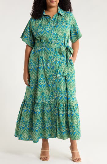 A stylized paisley pattern polishes the look of this ankle-length shirtdress cut from comfortable, breathable cotton and cinched at the waist by a tie self-belt.