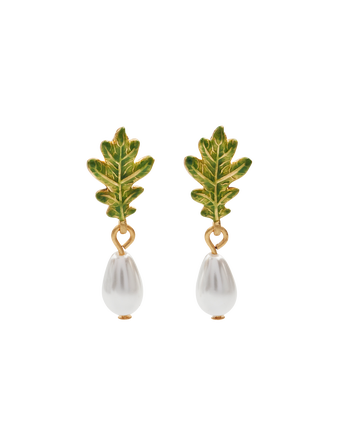 Hello Mother Nature! Show your love for the outdoors this season with these Oak Leaf Pearl Drop Earrings. Featuring a single hand-painted enamel oak leaf hanging from a natural pearl, these eyecatching accessories represent the verdant beauty of the forest and strength of the ancient oak tree.