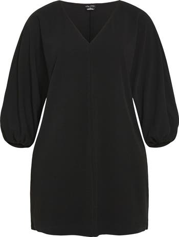 Voluminous elbow-length sleeves frame this sleek shift dress cut in a mini leg-baring silhouette.