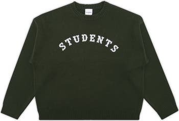 Collegiate graphic lettering define this crewneck sweater knit from soft cotton for everyday comfort.