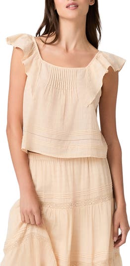 Fluttering sleeves frame this boxy cotton top accented with crisp pintucks and airy ladder stitching.