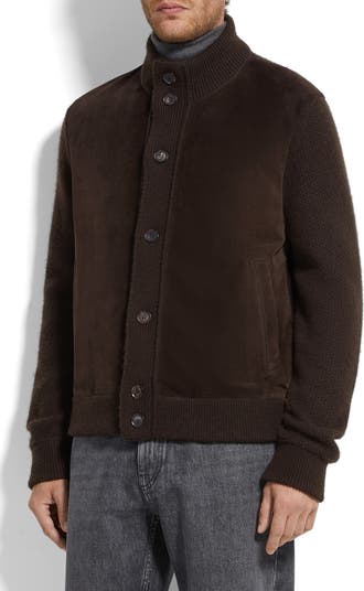 A study in texture and control, this leather-trimmed cardigan contrasts a lightly felted cashmere body with soft-knit sleeves and a clean stand collar, creating a sculpted frame that feels plush yet poised.