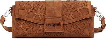Geometric inlays create textural intrigue on a slender shoulder bag fitted with an adjustable strap for easy on-the-go styling.