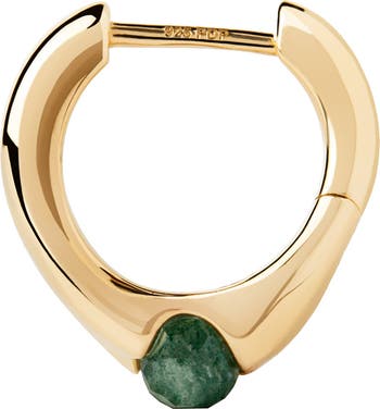 Gold-plated organic shape huggie single hoop featuring a round cut green aventurine