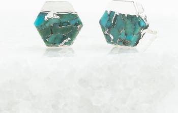 Our fan-favorite Oasis Studs are now available in stunning silver! Featuring natural turquoise stones woven together and dipped in shining sterling silver. The natural stones and hexagonal shape make the Oasis Studs the perfect combination of organic and modern. Perfect for daily wear and gifting alike! When you purchase the Oasis Stud Earrings, you help provide safe housing for women escaping exploitation. Also available in 14K Plated Gold: Oasis Studs in Gold Available at an exclusive price in our beautifully paired ready-to-gift set! Faithful Radiance Gift Set Box size and color may vary.