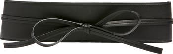 Define a silhouette with this wide belt elevated in rich leather and sweetened with a slender bow.