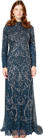 Gorgeous embellished maxi dress in navy color from our collection SS 2025. The stunning hand embellishments and beading will have all eyes on you and you sparkle all night long. Perfect for Prom, a black tie event or any special evening occasion.