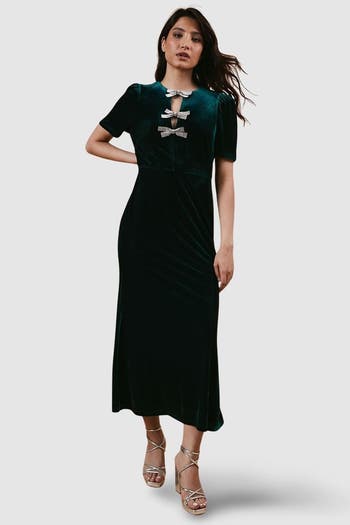 Make a striking entrance at your next formal event with this captivating Occasion Velvet Diamante Bow Midaxi Dress from Oasis. The plush velvet fabric creates a luxurious look and feel, perfect for those special moments that call for something extraordinary. The standout feature of this dress is undoubtedly the sparkling diamante bows adorning the neckline, adding a touch of glamour and femininity.