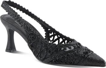 Intricately woven raffia creates artful dimension and highlights the mesh underlay on a slingback pump featuring a pointy cap toe and sculptural heel for elegant balance.