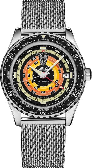 Explore the world and the ocean with this exceptional watch boasting neo-vintage diving aesthetics, 20 ATM water resistance and cutting-edge technology. The accurate timepiece features Calibre 80 movement with a revolutionary Nivachron™ balance spring for precision timekeeping, a GMT function for time zone display and bright Super LumiNova® hands and indexes for easy-to-read legibility in low-light conditions. The interchangeable stainless steel bracelet and textured rubber strap let you easily switch up how you wear this timepiece.
