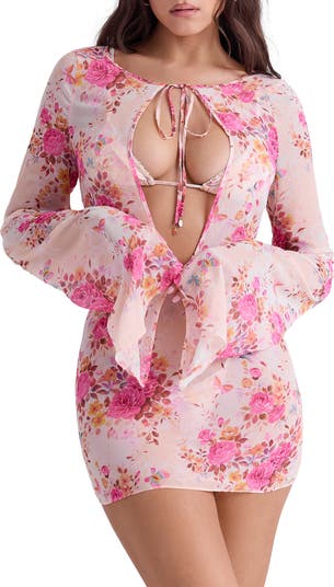 Oceana-A Sheer Long Sleeve Cover-Up Minidress