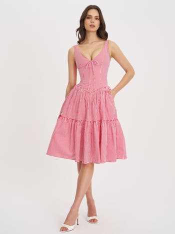 The Oceana Dress is a fresh take on summer charm, featuring a classic red and white candy stripe pattern that radiates playful elegance. Crafted from breathable cotton and fully lined for comfort, this midi silhouette showcases a flattering V-neckline with a delicate bow detail. Designed with a drop waist, it flares into a full, tiered skirt for effortless movement. Built-in bones offer structured support, while pockets and an invisible zipper add function without compromising the clean lines. A timeless piece for warm-weather days, picnics, or seaside strolls. Materials: Cotton Poplin: 100%Cotton Length from underarm: Approx 35.8 inch / 91 cm Stretch Factor: Non Stretch Clean: Dry-clean only Model Is Wearing A Size XS (US-2) Model Is 5'11'' Color may vary due to lighting on images. The product images (without model) are the closest to the true color of the product.