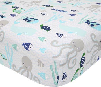 Assorted sea creatures in blue, turquoise, navy, and sea foam green add pops of color to this 100% cotton fitted crib sheet. There is an extra deep pocket for a secure fit and it is fully elasticized. Fits a standard size 28" by 52" crib mattress. Care Instructions: Machine wash cold with like colors. Gentle cycle. Do not bleach. Tumble dry low. Iron on lowest setting as needed. UPC: 084122674066. Imported.